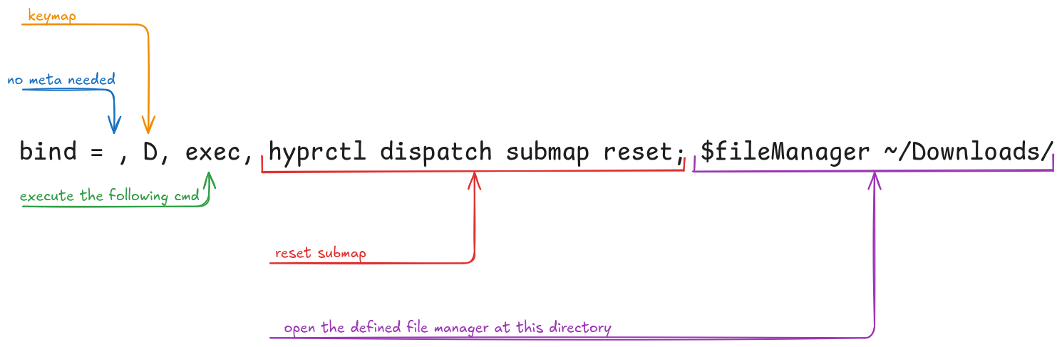 bind = , D, exec, hyprctl dispatch submap reset; $fileManager ~/Downloads/
